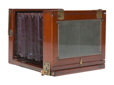A beautiful mahogany stereo camera with deep maroon bellows, dovetail joints, septum, and ivory maker’s label. The ground glass measures approximately 4 1/4 x 6 1/2 in. It is fitted with matching A.F.R. (Paris) lenses. They are marked Anastigmat Symetrique 1:5.8, F=135 mm. The lenses are numbered 288 and 227 and bear the motto “Sine Sole Nihil” (In English, “without the sun nothing”). According to McKeown’s Price Guide to Antique and Classic Cameras, 12th Edition, “Fallowfield was a dealer, not a manufacturer. Most if not all Fallowfield cameras and lenses were made for him by others.”