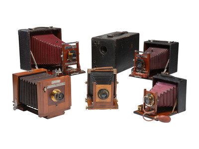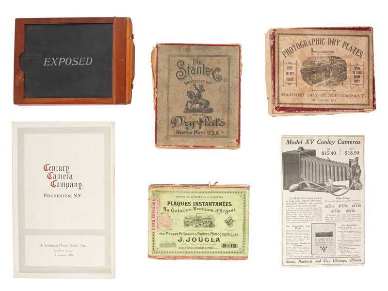 Hetherington & Hibben No. 1 magazine camera for 4 x 5 plates (scuffing and wear to surface throughout). Size 11 3/8 x 7 3/8 x 6 in. Ca 1892. -- Rochester Optical Co. New Model view camera for 4 x 5 plates (some surface wear to wood, bellows overall good). Size 9 x 6 3/4 x 6 1/2 in. Ca 1895. -- Conley Camera Co. 4 x 5 folding plate camera with bellows (some surface wear to leather, bellows overall good). Size 9 1/4 x 6 1/2 x 6 1/2 in. Housed in original case with holders (case is brittle, with surface wear and areas of separation). Ca 1900-1910. -- Conley Camera Co. 5 x 7 folding plate camera with bellows (some surface wear to leather, bellows overall good). Size 12 x 9 x 8 in. Ca 1908-1917. With printed advertisement. -- Century Camera Co. 4 x 5 folding plate camera with bellows (overall very good). Retailer's plate on side of camera, "Harvey & Lewis, Opticians, Hartford, Conn." Size 8 x 6 x 6 in. Housed in original case with holders and Century Camera Co. catalogue (some light scuffing and wear to case). Ca early 1900s. -- Unmarked 4 x 5 folding plate camera with bellows (some light wear to wood, bellows overall good). Size 7 x 6 x 5 1/2 in. Ca late 19th-early 20th century. -- With 3 boxes of photographic dry plates and a plate holder.