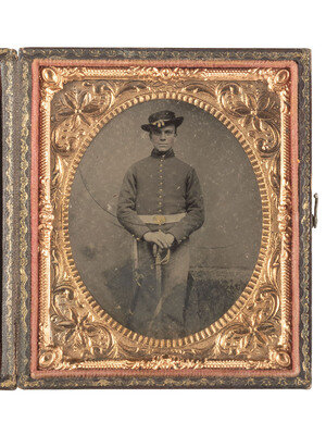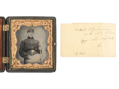 Sixth plate ruby ambrotype portrait of a seated soldier sporting an 1858 mounted services jacket and armed with a sword and what appears to be a Smith & Wesson No. 2 revolver tucked into his belt. (Some tarnishing and chemical discoloration to image, mostly around edges.) Housed in a Union case (significant nicking/chipping, soiling, loose hinge). Accompanied by a yellow embossed cover addressed "In Haste" to Mr. Martin F. Zimmermann, Co. A, 1st DC Cavalry, at "Camp Near Deep Creek, Va." -- Sixth plate tintype portrait of a soldier standing in uniform including a buff 1839 dragoon belt and 1833 dragoon saber, porkpie hat, and 1858 mounted services jacket. His appearance is suggestive of service in the western theater. (Some scratches, spots, and other imperfections.) Housed in a pressed paper case (separation to spine, surface wear and loss throughout). -- Together, 2 images.