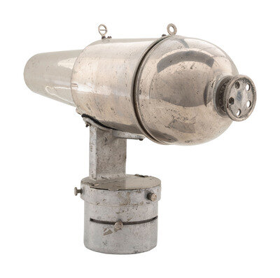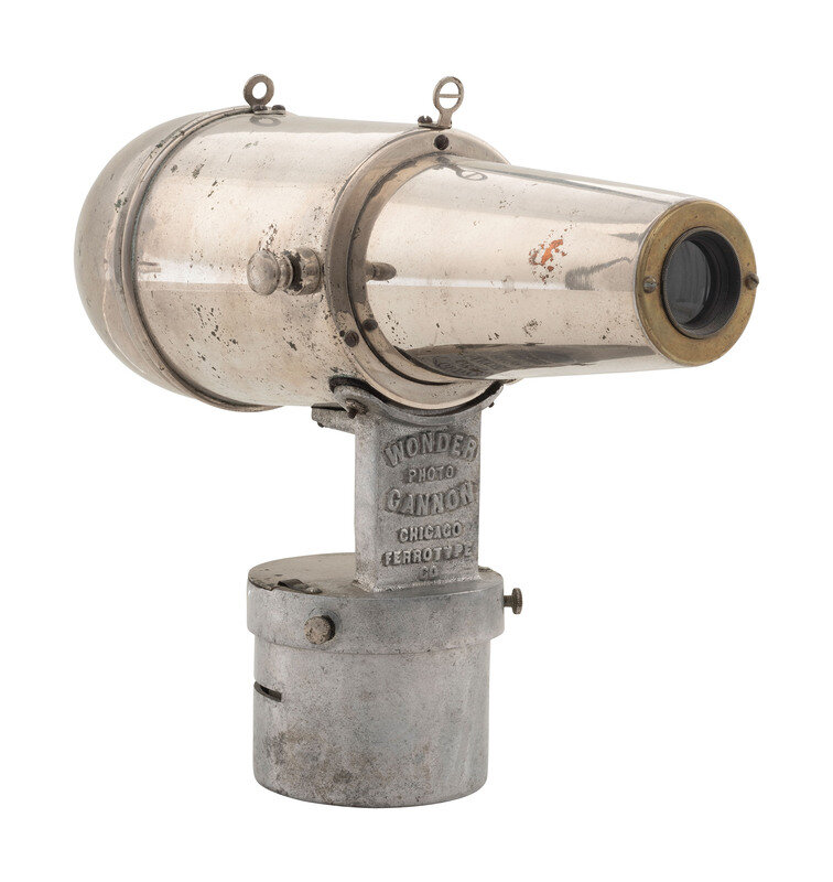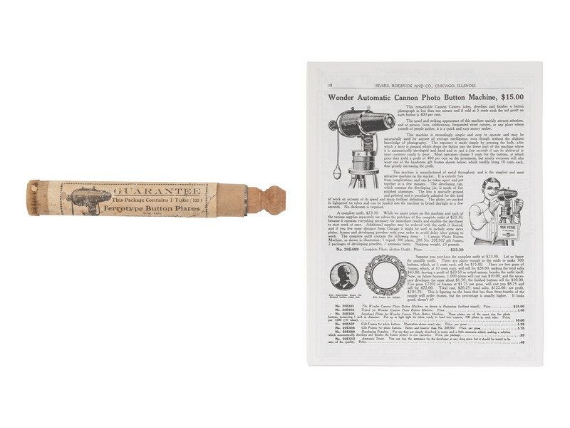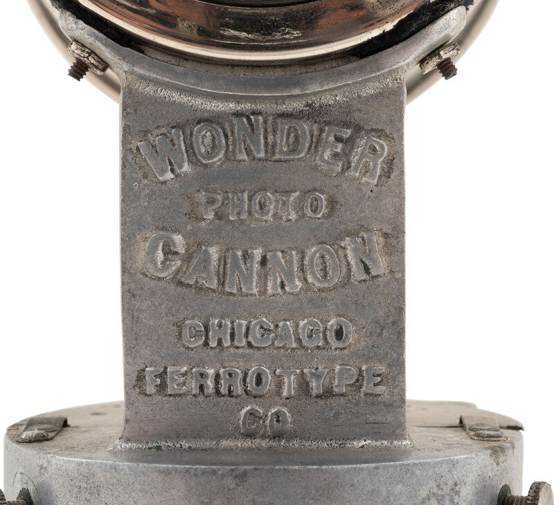 Wonder Automatic Cannon Photo Button Machine manufactured by the Chicago Ferrotype Co., Chicago, IL, ca 1910s-1920s. An unusual street camera comprised of metal, used for taking and developing 1 in. dia. button photographs. Size 13 1/2 x 9 x 4 1/2 in. (occasional spotting throughout). With rare sleeve of tintype buttons and modern reprint of a period advertisement for the Wonder Automatic Cannon Photo Button Machine.