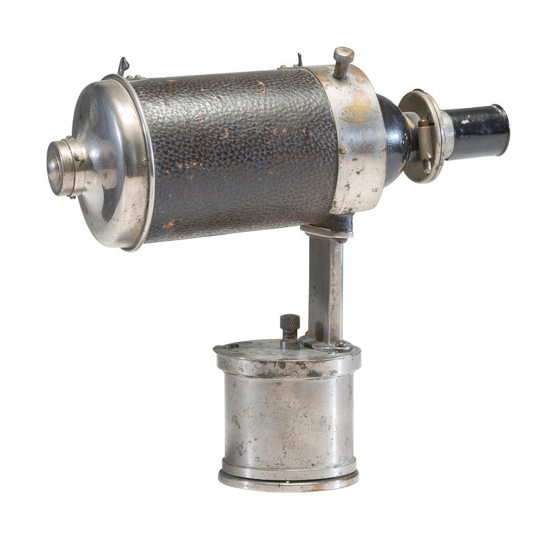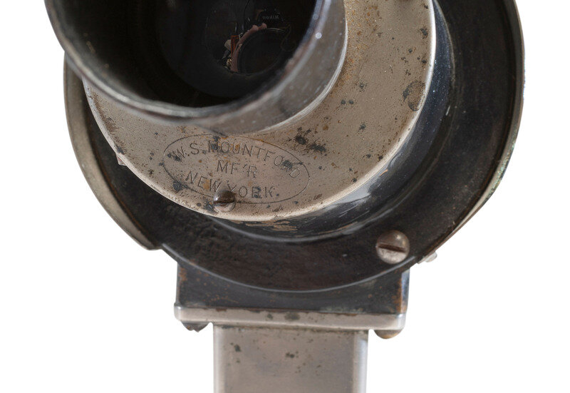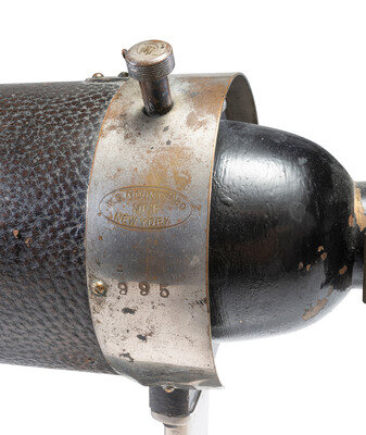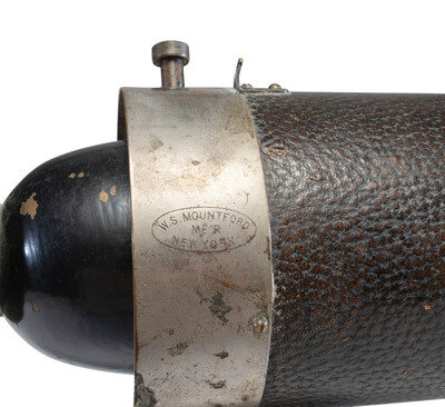 Leather covered cannon-style tintype button camera capable of taking one hundred 1 in. tintypes, manufactured by W.S. Mountford, New York, ca 1920s. Size approx. 12 x 11 x 4 1/2 in. (some surface wear to leather, occasional spotting throughout body of camera). Accompanied by a modern reprint of a period advertisement for the Mountford "Camerascope."