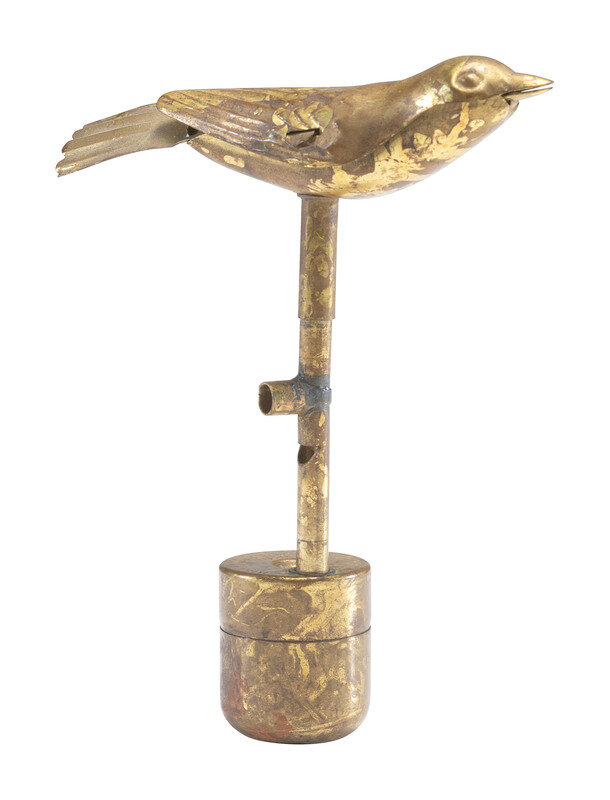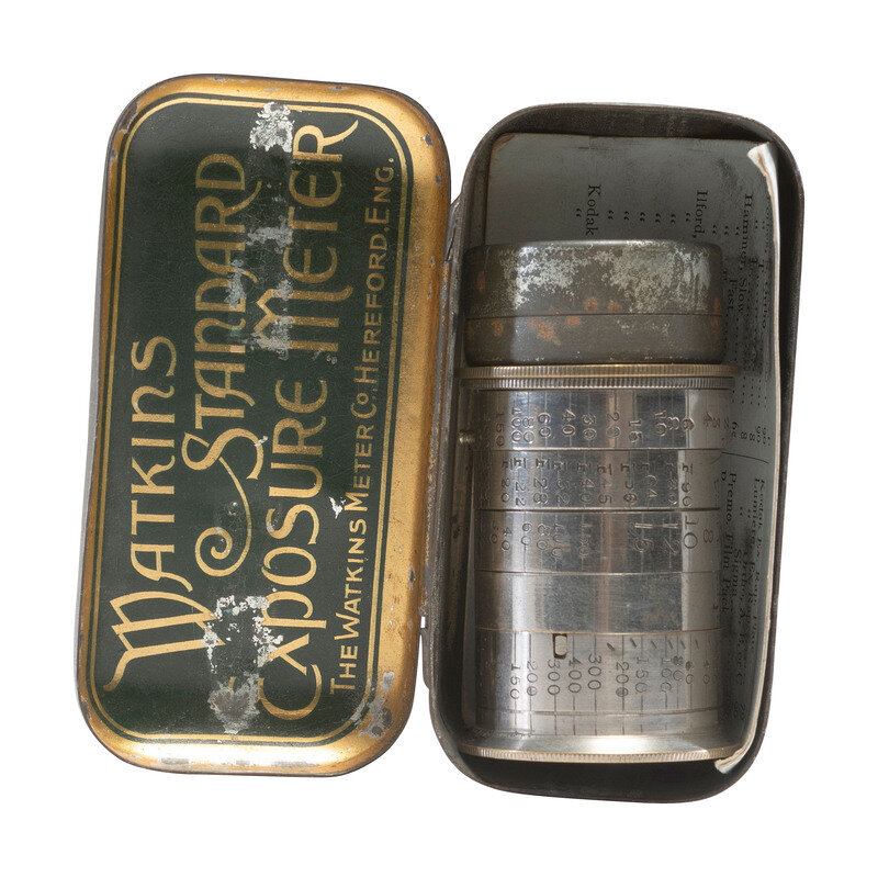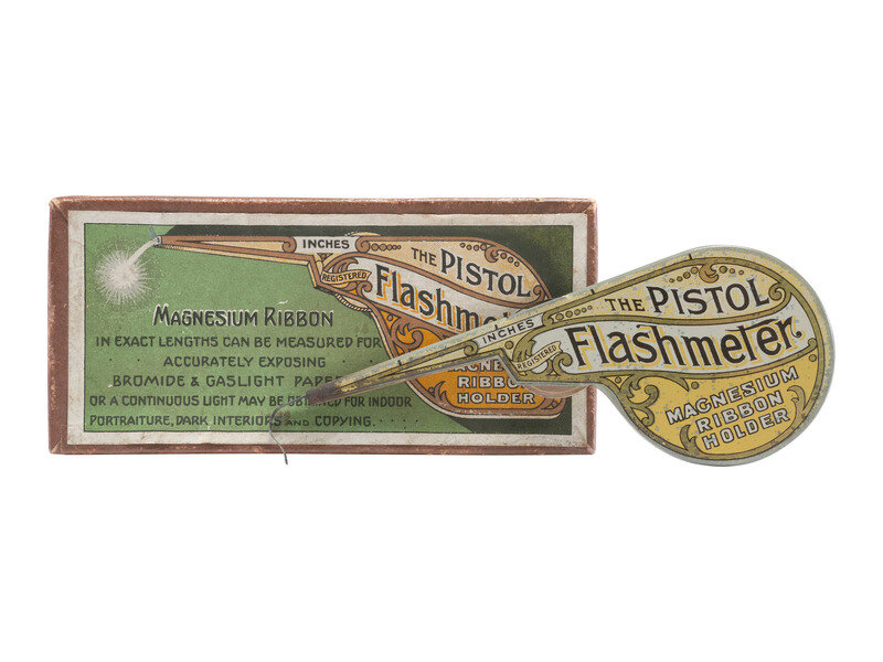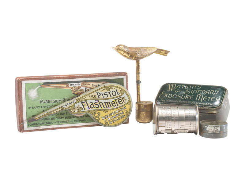 The Pistol Flashmeter. English "tin pistol" for "accurately exposing bromide & gaslight papers," exact length of magnesium ribbon determined by inch or meter scale. Directions on reverse side of pistol indicates use for "Gaslight Prints or Lantern Slides." Size approx. 2 x 5 3/4 in. With original box, ca 1900 (some light spotting, areas of minor rusting to tin, handling wear to box). -- Watkin's Standard Exposure Meter manufactured by the Watkins Meter Co., Hereford, England. Pendulum style exposure meter. Height approx. 2 in., diameter 1 3/8 in. With original tin box and instructions, ca 1900 (some surface wear to meter and tin box). -- Original brass "Watch the Birdie" figure, height approx. 4 in. (some surface wear throughout).