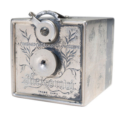 The Kombi camera, made entirely of brass, serial no. 324, size approx. 1 3/4 x 1 3/4 x 2 1/8 in. Manufactured by Alfred C. Kemper of Chicago, IL, ca 1893. The first miniature camera to use roll film (some tarnish and light surface wear). With 1975 reprint of the Kombi Photography instruction booklet and copy of The Photographic Collectors' Newsletter, 1975, with diagram of the Kombi on the front cover. -- Expo Watch camera, comprised of a small detective camera stylized in the form of a pocket watch, size 2 in. diameter. Manufactured by Expo Camera Co., New York, ca early 1900s. With original instruction booklet (camera in overall good condition).
