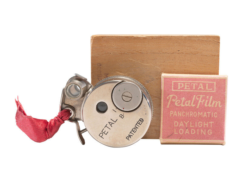 Petal subminiature camera, approx. 1 1/8 in. diameter. Manufactured ca 1947 or 1948 by the Petal Optical Company of Japan. The camera is accompanied by its original wooden box, 1 x 1 3/4 x 2 1/4 in., red ribbon, Petal Film, and instructions.