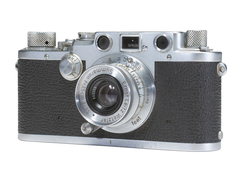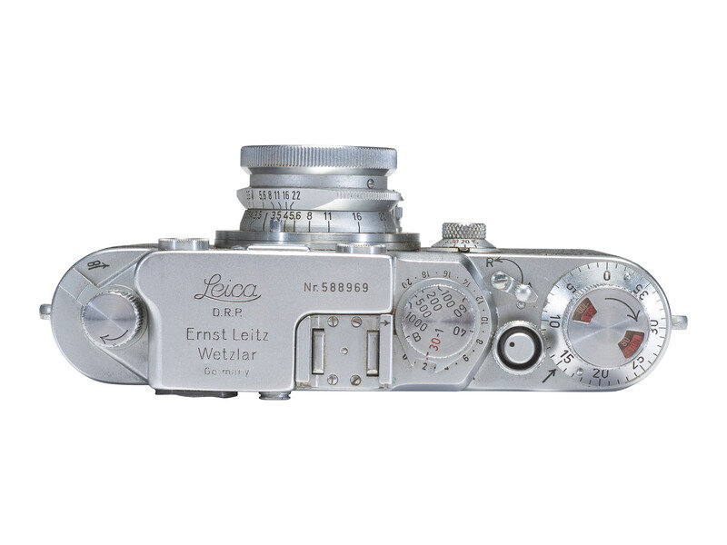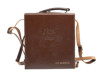 Leica III camera, top marked "Ernst Leitz Wetzlar, Germany," and "Nr. 588969." With Summaron f3.5 lens. Accompanied by camera case and contemporary Leica literature for the Synchronized Leica and Leica IIIc. -- 9 3/4 x 8 3/4 x 3 1/4 in. Leitz Leica case identified on cover to D.H. Mackenzie, containing various accessories.