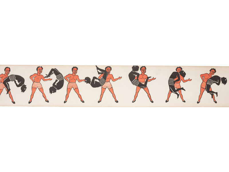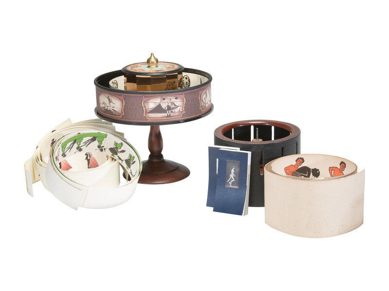 [With:] "Wheel of Life" illustrated strip, approx. 3 1/4 x 36 in. (some toning, edge wear to strip). -- Silver gelatin photograph of Walt Disney looking at a Praxinoscope, 7 1/2 x 9 1/2 in. (sight), matted and framed. -- 2 modern flip books showing Eadweard Muybridge's studies of a "jumping horse" and "woman using skipping rope."