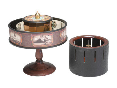 "Hemisferium," replica Praxinoscope, comprised of a wooden base, on which a drum with 12 mirrors that produce the optical illusion, thanks to the reflection of the images, rotates in a smooth and balanced way. The drum features images inspired by late 19th-early 20th century circus imagery. Drum diameter 8 in., height approx. 8 1/2 in. with 15 paper strips. With original "Hemisferium" box and booklets issued by the manufacturer, based in Spain. (Excellent condition.)