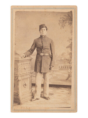 CDV full standing portrait of a young soldier wearing a frock coat with oval US belt plate and cap (some toning, unevenness to edges of print; mount with some soiling and wear). Lower left of mount embossed with Ball's 30 W. 4th St. imprint.