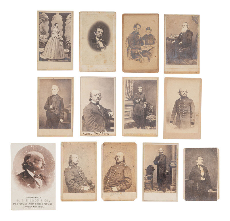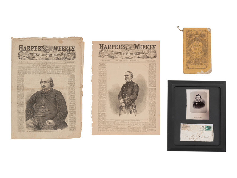 12 CDV portraits of Civil War subjects including (4) Benjamin F. Butler, General Ambrose Burnside, Admiral Farragut, Gideon Welles, Alexander Stephens, William G. Brownlow, and 3 others including engraved portraits of Abraham Lincoln and Varina Davis. -- A postally used cover addressed to Alexander Stephens at Liberty Hall from Attorney E. H. Harman of Macon, GA. -- A lithograph card featuring a portrait of General Benjamin F. Butler advertising the "O. J. Bishop & Co., Dry Goods and Fancy Goods" store in Antwerp, New York. -- An 1863 Farmer's Almanac. No. 71. Boston: Brewer & Tileston. -- An issue of Harper's Weekly featuring an illustration of General Benjamin Butler on front cover, dated 1 June 1861. -- And a Harper's Weekly cover (only) featuring an illustration of Admiral Farragut, dated 29 August 1863. -- Together, 17 items.