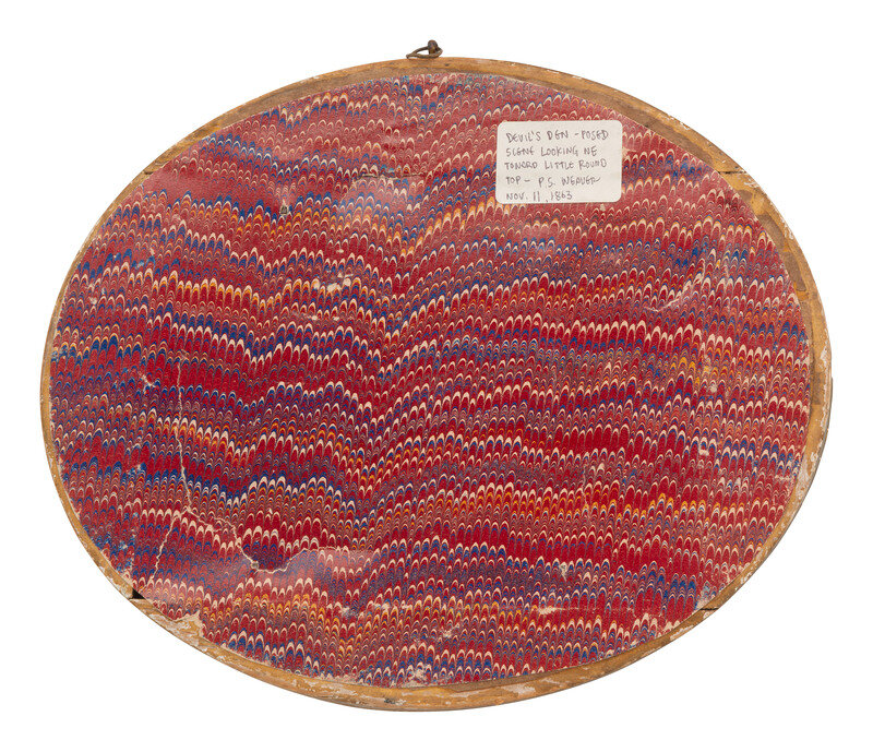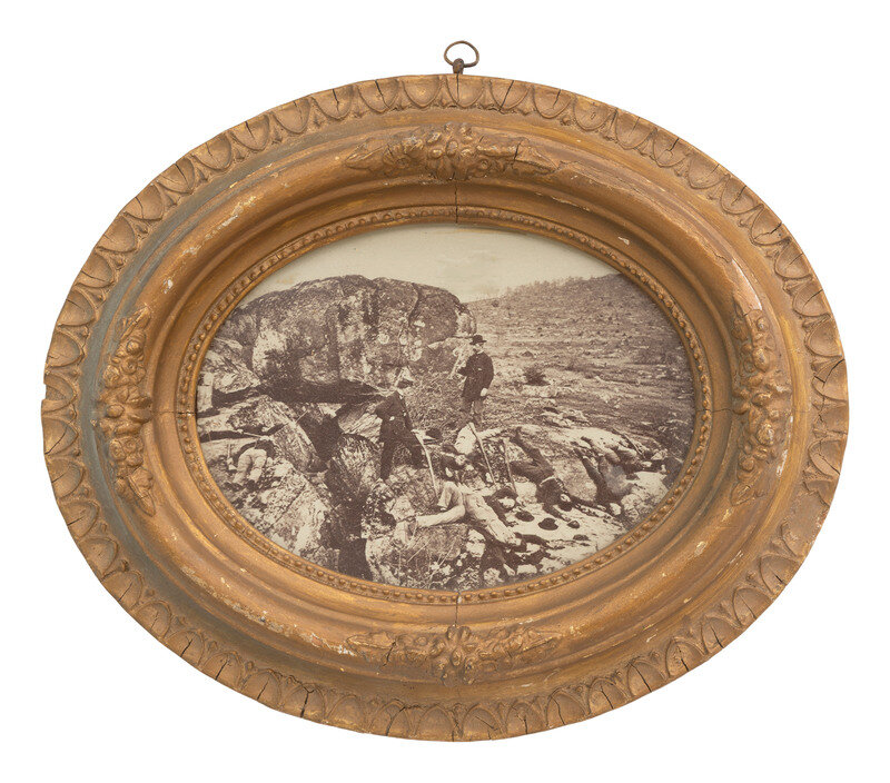 4 3/8 x 6 in. (sight) albumen photograph of two men standing among rocks and what appear to be dead bodies at Devil's Den, housed in an oval gilt frame, 8 x 9 1/2 in. overall (print with some light imperfections, not examined out of the frame; frame with some cracks and surface wear throughout).