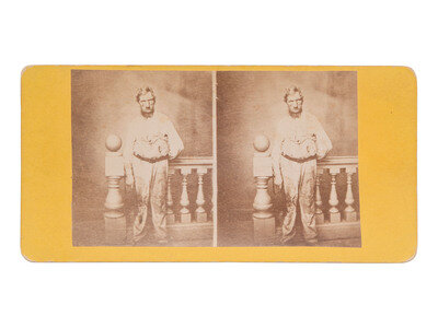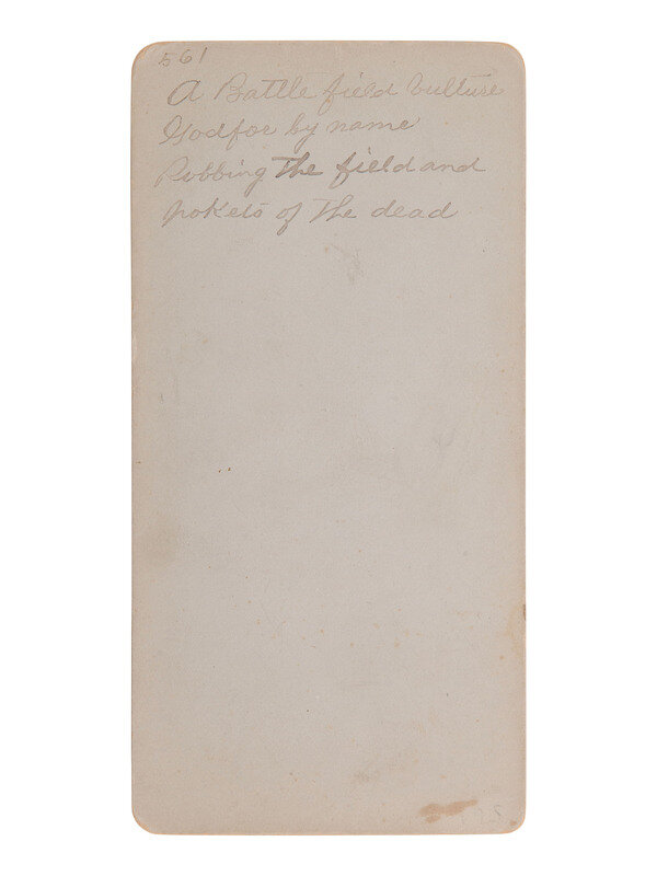 Stereoview on yellow mount featuring a rough-looking man wearing dirty and possibly tattered clothes, and with what appears to be some dirt on his face. Uncredited, but possibly published by Tyson & Tipton. Verso bears ink inscription reading, "561 / A Battle field vulture / Godfor by name / Robbing the field and pockets of the dead."
