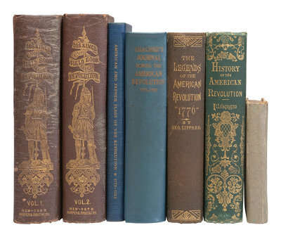 LOSSING, Benson J. The Pictorial Field-Book of the Revolution; Or, Illustrations, By Pen and Pencil, of the History, Biography, Scenery, Relics, and Traditions of the War for Independence. Vols. & II. New York: Harper & Brothers, Publishers, 1860. --THACHER, James M.D. A Military Journal During the American Revolutionary War, From 1775 to 1783; Describing the Events and Transactions of This Period, With Numerous Historical Facts and Anecdotes. Hartford: Silas Andrus & Son, 1854. -- LIPPARD, George. The Legends of the American Revolution. "1776." Or, Washington and His Generals. Philadelphia: Leary, Stuart & Company, 1876. -- MOORE, Frank. Songs and Ballads of the American Revolution with Preface by Prof. Henry L. Williams. New York: Hurst & Company, 1905. -- SCHERMERHORN, Frank Earle. American and French Flags of the Revolution, 1775-1783. Philadelphia: Pennsylvania Society of Sons of the Revolution, 1948. -- The Pictorial History of the American Revolution; with a Sketch of the Early History of the Country, the Constitution of the United States, and a Chronological Index. Boston: Lee & Shepard, n.d. 433pp.