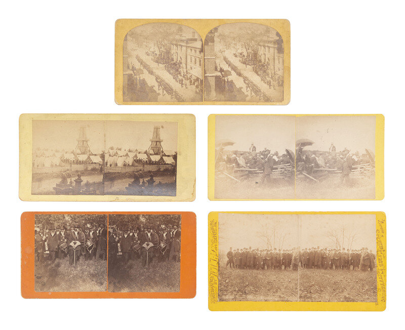 5 stereoviews on yellow and orange mounts, including: A cabinet-sized view of General Hancock, members of his staff, and other men, all dressed in coats and top hats, gathered near the spot where he was wounded at Gettysburg. Gettysburg, PA: W. H. Tipton, n.d. -- A view of a GAR camp complete with tents and a large tower-like structure. Gettysburg, PA: L. Mumper, n.d. -- A view of a GAR parade proceeding down Washington Street in Salem, Massachusetts. Salem, MA: Perkins & Lefavour, n.d. -- And 2 uncredited/unidentified views featuring groups of GAR members including a likely Gettysburg Battlefield reunion. -- Together, 5 stereoviews.