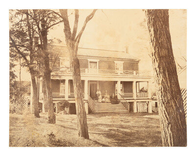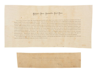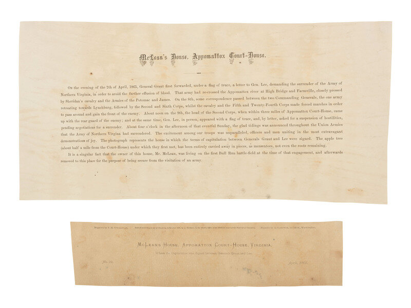 McLean's House, Appomattox Court-House, Virginia, Where the Capitulation was Signed between Generals Grant and Lee. Albumen silver print, 6 15/16 × 9 1/8 in., affixed to later cardstock mount, approx. 9 × 11 1/16 in. overall. With partial printed label including credit to the photographer, Timothy O'Sullivan, the printer, Alexander Gardner, 1866 copyright, image title, date, and plate number. From Gardner’s Photographic Sketchbook of the Civil War, Vol. II, plate 99), April 1865. The descriptive label from Gardner's Photographic Sketchbook is also enclosed.