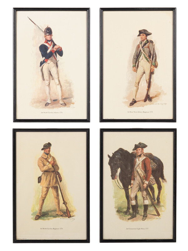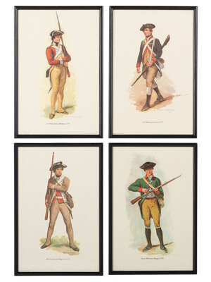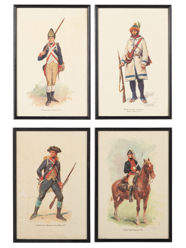 Set of 12 framed Raymond Desvarreux Larpenteur Revolutionary War military prints, by Alfred B.C. Batson (c. 1956-1959) depicting Revolutionary War soldiers, including: "1st Pennsylvania Battalion 1775," "Benedict Arnold's Detachment Quebec, Winter 1775," "3rd New York (Ulster) Regiment 1775," "Green Mountain Rangers 1776," "Virginia Light Dragoons 1776," "Delaware Blues (Haslet's) 1776," "2nd South Carolina Infantry 1776," "3rd New Jersey Regiment (Jersey Blues) 1777," "2nd Connecticut Light Horse 1777," "2nd Maryland Infantry 1777," "3rd North Carolina Regiment 1778," "18th Continental Regiment 1778." Each framed to approx. 11 x 16 3/4 in.
