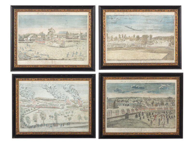 [With:] Group of 4 modern copies of Amos Doolittle (1754-1832) Revolutionary War prints, including Plates I-IV: "The Battle of Lexington," "A View of the Town of Concord," "The Engagement at the North Bridge in Concord," and "A View of the South Part of Lexington." Each framed to approx. 22 x 17 in.