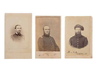 CDV vignetted half portrait of 1st Lieutenant Obadiah B. Hewitt, 2nd Nebraska Cavalry, wearing his uniform including slouch hat with crossed saber device and regimental insignia "2," and shoulder straps indicating the rank of 1st lieutenant. Signed in ink on image, "Yours Truly, O. B. Hewett." -- CDV Seated portrait of Captain Marcus L. Hewett, 21st Maine Infantry, wearing his uniform with shoulder straps indicating rank of captain. New York: Kertson & Barker. Identified in ink on mount recto, "Capt Hewett" and inscribed on verso "To Mrs. James H H Hewett" (possibly in Marcus Hewett's hand). -- CDV vignetted bust portrait of Major James H. H. Hewett, 8th Maine Infantry, wearing uniform with shoulder straps indicating rank of 1st lieutenant. Bath, ME: Geo. W. Butler. Identified in pencil on image. 3-cent revenue stamp affixed to verso. -- Together, 3 CDVs.
