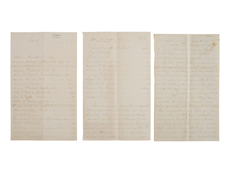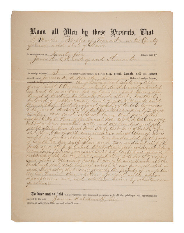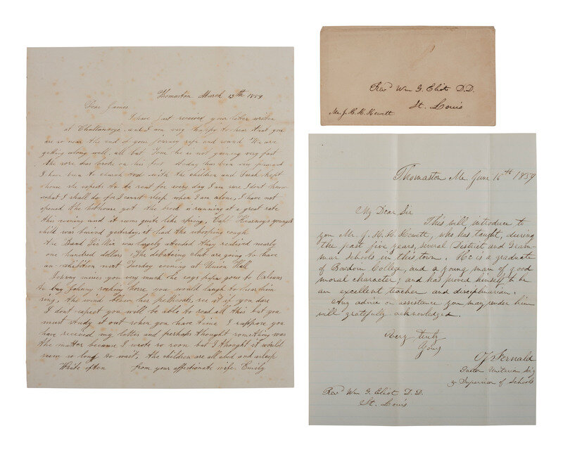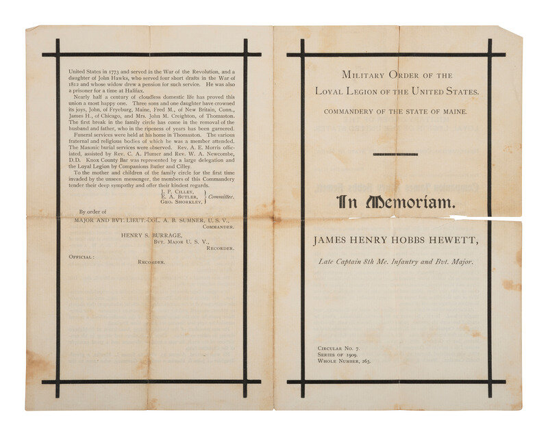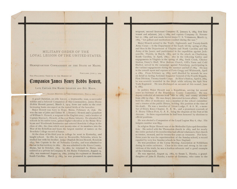 (2) Military Order of the Loyal Legion of the United States memorial programs for James Henry Hobbs Hewett. -- A letter from a Unitarian pastor addressed to Reverend William Eliot of St. Louis. Thomaston, ME, 16 June 1859. Accompanied by addressed cover. One page, introducing James Henry Hobbs Hewett and recommending him as a "young man of good moral character" and "an excellent teacher and disciplinarian." -- An 8pp letter from "S. C. Hewett" (possibly James H. H. Hewett's cousin, Simon Crane Hewett), addressed to "James," and dated 1884. Detailing the genealogy of the William Hewett and Payson families, referencing the Crane and Tolman branches and suggesting details of family members' whereabouts during the Revolutionary War era. With typewritten transcription. -- Typewritten "Hewitt genealogy as far as I (Sarah Hewett Thomas) know of it." Comprising 2 pages on tissue paper. -- A warranty deed of property from Martha J. Shibles to James Henry Hobbs Hewett, paid for in the amount of 25 dollars. Undated. -- Together, 6 documents related to James Henry Hobbs Hewett.