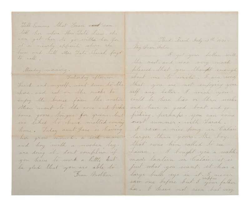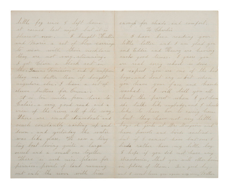 3 war-date letters dated 26 February 1865, addressed to "Father," from children Emma, Hattie, and Eloise. It is unclear who the father of these children is, though it is likely that he is some relation to James Henry Hobbs Hewett. -- Letter addressed to "My Dear John" from "Mother." Red Beach[?], 17 July 1870. The identity of the recipient is unclear, though likely some relation of James Henry Hobbs Hewett. -- Letter addressed to "James" (likely James A. Creighton, father of John M. Creighton Sr., who married a daughter of James Henry Hobbs Hewett) from wife, Emily. Thomaston, [ME], 13 March 1859. One page, describing the goings-on at home, including a report that "Capt Kearney's youngest child was buried yesterday, it had the whooping cough." -- Another letter to the same recipient as previous from the same writer as previous (likely to James A. Creighton, from wife Emily). Thomaston, [ME], 28 February 1865. -- And some newspaper clippings and additional photographs.