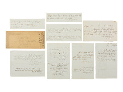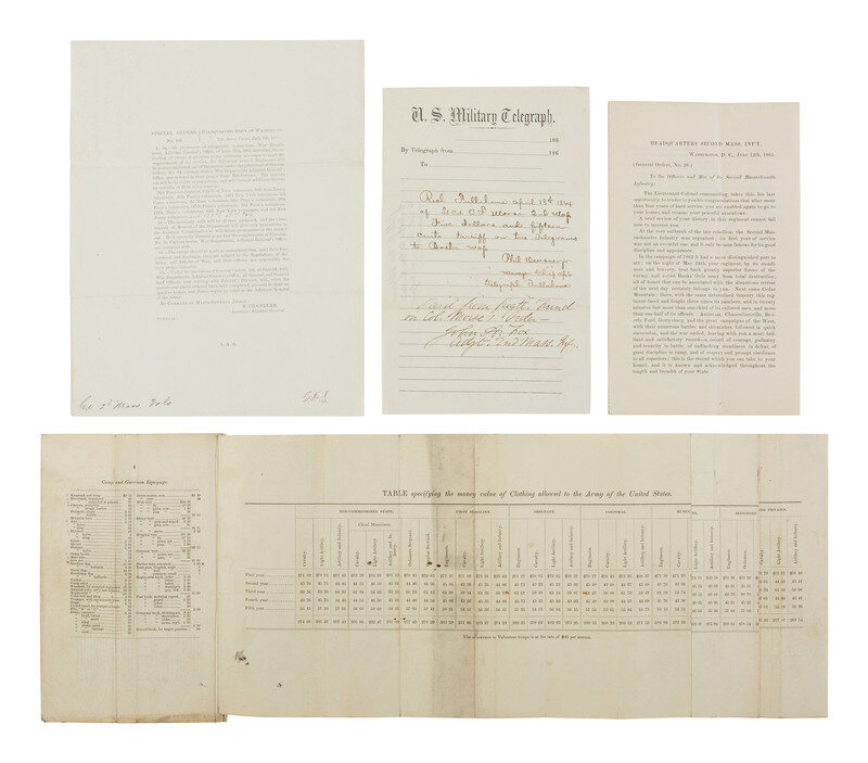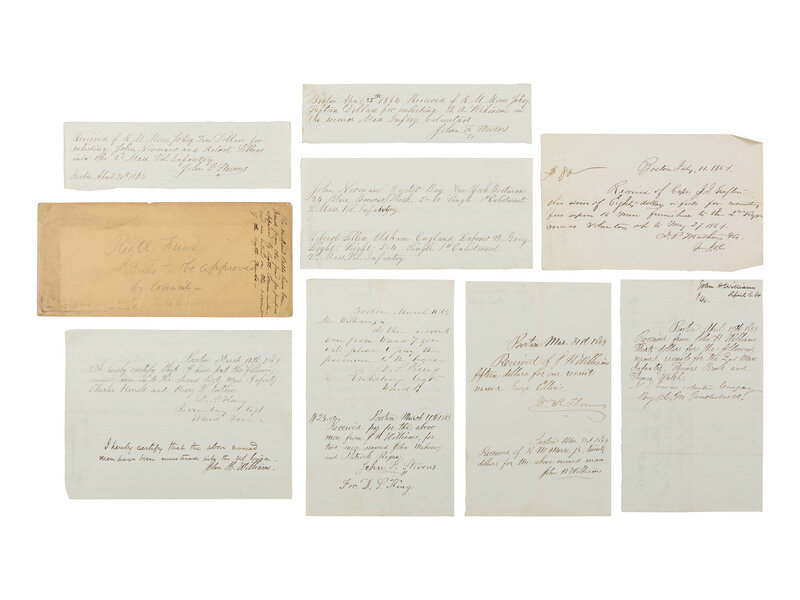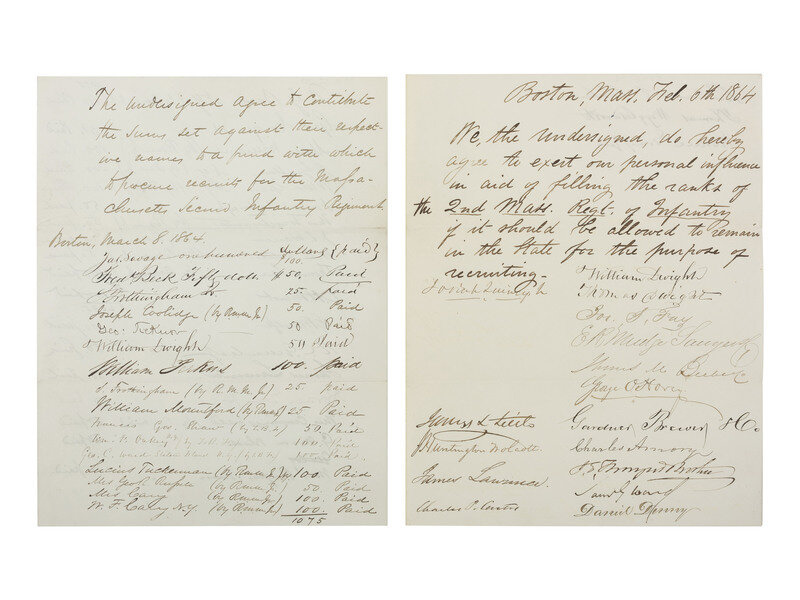 Group of approx. 20 documents, 1863-1865, highlighted by two documents related to recruitment for the 2nd Massachusetts Infantry regiment featuring signatures of prominent Bostonians who aided recruitment efforts: "Paper signed by Wm. Dwight and others pledging their influence to aid in recruiting for the regiment." Boston, Massachusetts, 6 February 1864. 2pp, 7 3/4 x 10 in. "We, the undersigned, do hereby agree to exert our personal influence in aid of filling the ranks of the 2nd Mass Regt. of Infantry if it should be allowed to remain in the state for the purpose of recruiting." Signed by 19 individuals including Josiah Quincy, Jr., William Dwight, Thomas Dwight, James Lawrence, Thomas Wigglesworth, Horace Gray, Jr., Charles Armory, J. Huntington Wolcott, and Joseph S. Fay. -- "Subscriptions for recruiting Regt," Boston, 8 March, 1864. 2pp, 7 3/4 x 10 in., states: "The undersigned agree to contribute the sums set against their respective names to a fund with which to procure recruits for the Massachusetts Second Infantry Regiments." Among the 34 individuals identified as donating to the fund are the following: James Savage (1784-1873), a prominent banker whose son James Savage, Jr., captain 2nd Massachusetts Infantry, was shot and DOW following the Battle of Cedar Mountain; Francis George Shaw (1809-1882), abolitionist and father of Col. Robert Gould Shaw; William Dwight (1805-1880), father of Union Brigadier General William Dwight, and Lt. Col. Wilder Dwight, DOW at Battle of Antietam while serving with the 2nd Massachusetts Infantry; Josiah Quincy, Jr. (1802-1882), a former mayor of Boston; and William Perkins (1804-1887), a Boston merchant whose son William E. Perkins served in the 44th and 2nd Massachusetts Infantry regiments.