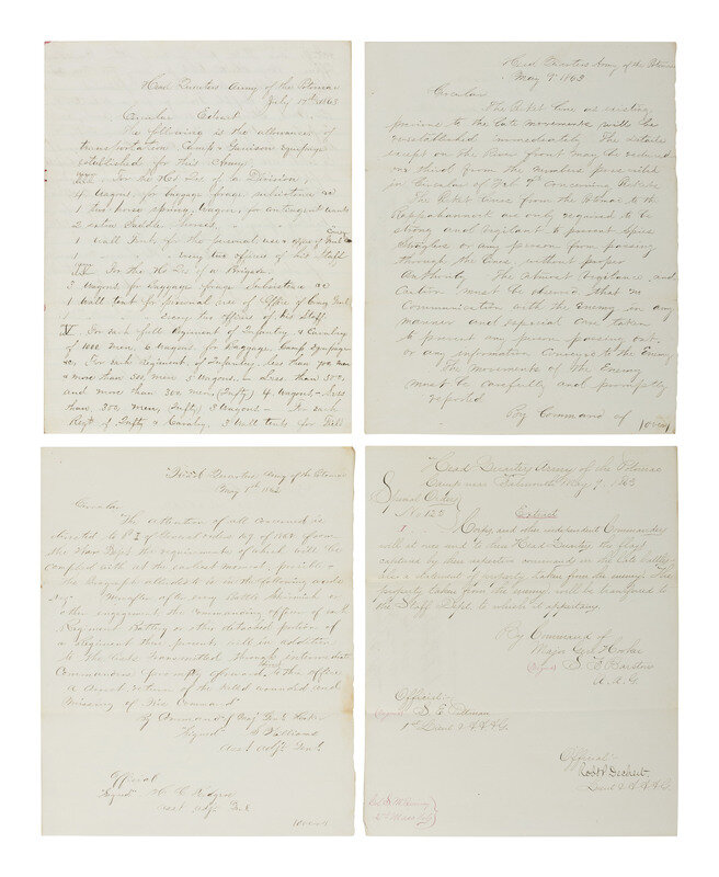 Additional documents include: group of 8 receipts for recruiting agent payments for the 2nd Mass. Infantry. -- Receipts for supplies, including "10 Drum Heads." -- Several printed orders and 3 manuscript circulars and 1 manuscript special orders, including one related to transportation orders following the Battle of Gettysburg, one related to picket lines after Chancellorsville, and another related to returns of the killed and wounded following Chancellorsville.