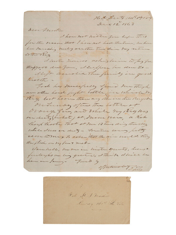 MADILL, Henry J. ALS as Colonel of the 141st PA Volunteers, describing being "shot at...13 times" during the Mine Run Campaign. "Hd Qrts 141st Pa Vols.," 2 December 1863.