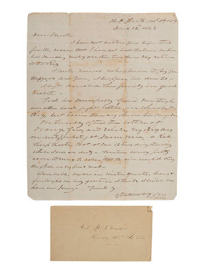 One page, 7 7/8 x 10 in., heavily creased at folds, with toning and some holes along creases, small separations to edges, corner creases, and some brown spotting throughout. Accompanied by unused envelope addressed to "Col. H. J. Madill, Com'd'g 141st Pa. Vols."