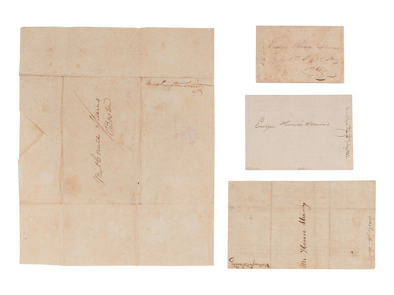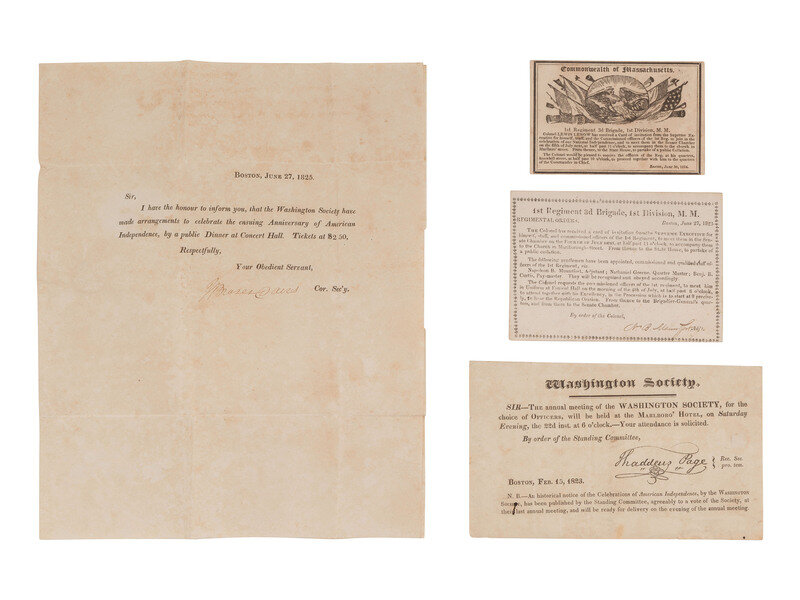 Group of 2 items, comprising: 6 1/4 x 3 3/4 in. printed invitation to "the annual meeting of the WASHINGTON SOCIETY, for the choice of Officers" to be held at the Marlboro Hotel. Boston, 15 February 1823. Signed in type by Thaddeus Page, as Recording Secretary. (Seal removed, light creasing and toning). Manuscript identification on verso "Mr. Horace Stearns." -- Printed event announcement, 1p, 8 x 10 in. (creasing at folds, toning), folio, with integral address leaf. Boston, 27 June 1825. The Corresponding Secretary for the Washington Society writes to inform the recipient that the Society has made arrangements "to celebrate the ensuing Anniversary of American Independence, by a public Dinner at Concert Hall. Tickets at $2.50." Addressed to "Mr. Horace Stearns / Boston."