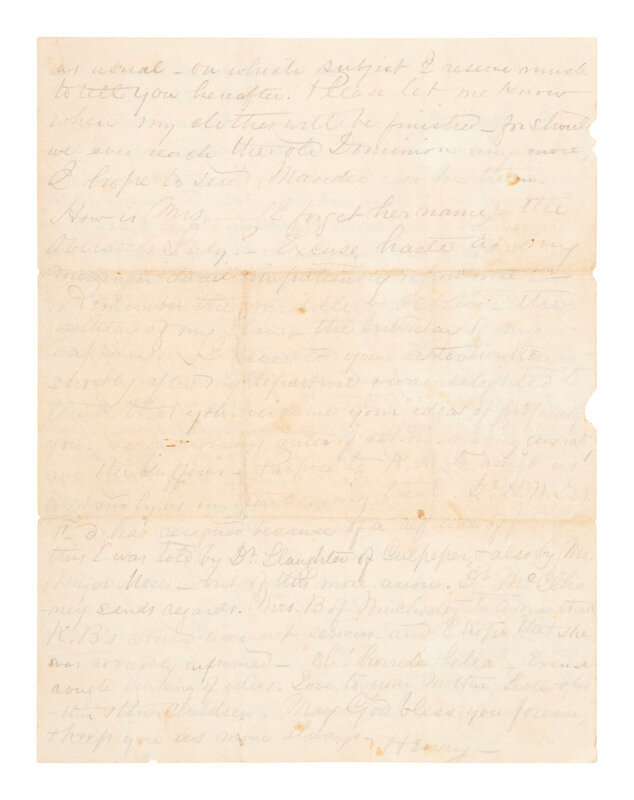 In this letter addressed to "My Darling Jean," and signed simply "Henry," the writer wastes no time explaining the circumstances of his brief opportunity to write a letter: "In the midst of scenes of battle & of carnage I have barely time to take advantage of the very earliest opportunity to write you since leaving dear old Virginia. I have not been able to mail a letter previously or you should certainly have heard from me."