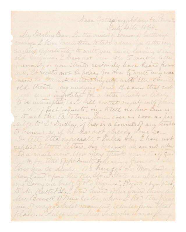 [CIVIL WAR]. Battle of Gettysburg letter penned by a Confederate surgeon. "Near Gettysburg," 4 July 1863.