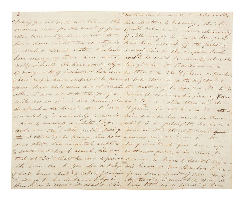 Anna writes initially of Sioux atrocities in the Dakota Territory, family news, and the loss of many men in battle, noting the efforts of parents to recover bodies of their sons who perished recently at the Battle of Gettysburg. She then continues: "We hear constantly of many acts of individual heroism where people seem inspired to perform deeds that seems almost incredible. I now want to tell you of a noble woman who is here nursing her husband. She heard that he was wounded and immediately procured a horse & waving a white flag rode over the battle field during the thickest of the firing, her horse was shot. She mounted another & continued her search. She was told at last that he was a prisoner she rode over to Gen Lee or Early (I don't know which) & asked permission to search for her husband's body in their lines ... He told her he so much admired her devotion & bravery, that he would release him unconditionally if still living. She found him and had him carried off the field...." Anna then continues describing how [Arabella Barlow] was able to have her husband's body moved to Baltimore when he was well enough to travel, and he has been cared for at 'The Hopkins on Franklin St.'...His name is Gen Barlow & he is from some part of New York...."