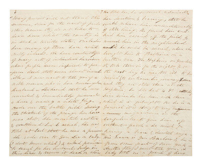 Autograph letter signed from "Anna" to her "Aunt Mankin," Mrs. Isaiah Mankin (Martha Bininger Gautier Mankin), of Mount Vernon, West Chester County, New York. Baltimore [Maryland], 26 July 1863. 10pp, approx. 5 3/4 x 7 1/2 in. (pages 9/10 approx. 7 1/2 x 3 1/2 in.). Descriptive letter in which the young niece provides details on contemporary events, including the purported battlefield heroics of Civil War nurse Arabella Griffith Barlow (1824-1864), wife of Union General Francis Channing Barlow (1834-1896), WIA Gettysburg.