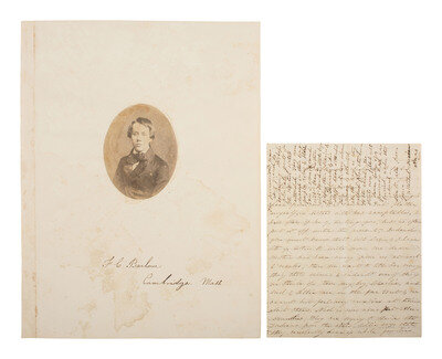 [With:] Disbound album page, approx. 8 3/4 x 11 3/4 in., featuring an oval cut albumen photograph of a youthful Francis C. Barlow, with manuscript identification below image "F.C. Barlow / Cambridge Mass." Undated, ca 1855. Possibly an album page from a Harvard University album. Barlow graduated Harvard first in his class in 1855.