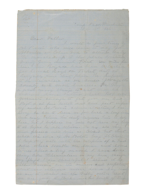 In this letter addressed to his father, Sergeant Lewis Wardlaw discusses his regiment's wellness, both physically and in light of new leadership under Colonel James M. Perrin. He writes, "Our Brigade had been detached for several days on picket duty at Berryville...Our Regt is in fine health now and fast improving under Col Perrin's administration... We are all very much pleased with him as Colonel but don't relish the idea of Joe Norton being Lt. Colonel."