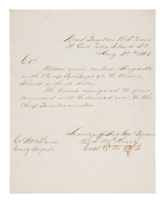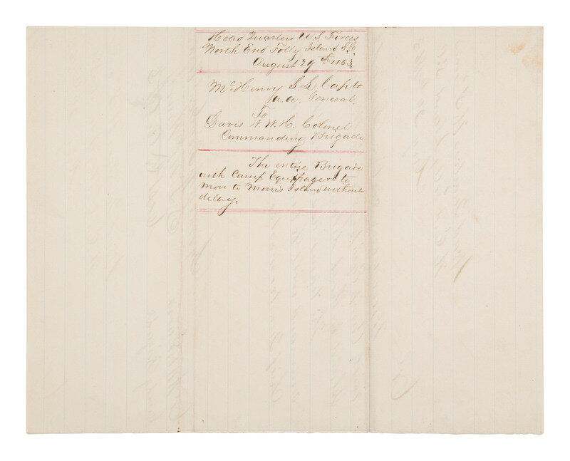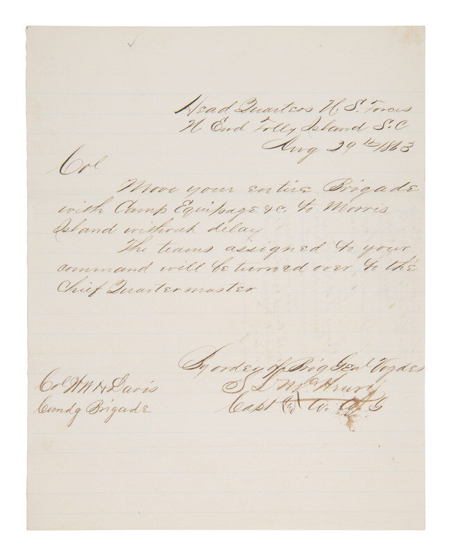 By order of Brigadier General Israel Vogdes (1816-1889) Col. Davis is to move his "entire Brigade with Camp Equipage & c. to Morris Island without delay." Order issued in the aftermath of the July 18, 1863, Battle of Fort Wagner during which Union forces failed to capture the fort, but the bravery of the 54th Massachusetts Infantry significantly boosted morale and demonstrated the heroism and fighting capabilities of African American soldiers. Federal soldiers then resorted to land and sea siege operations. After 60 days of shelling and siege, the Confederates abandoned Fort Wagner on September 7, 1863, just over a week after this order was given.