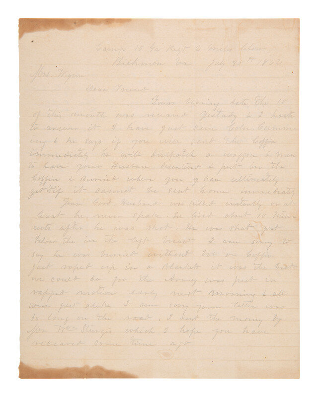 Letter to a Confederate soldier's wife detailing her husband's death and field burial, with instructions to send a coffin. "Camp 10 Ga Regt 2 miles below Richmon [sic] Va," 30 July 1862.