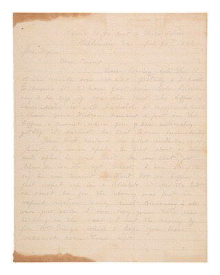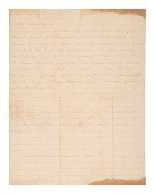 1 1/2 pages, 7 1/2 x 9 3/4 in., creased along old folds, with toning and dampstaining. Addressed to "Mrs. Wynn."