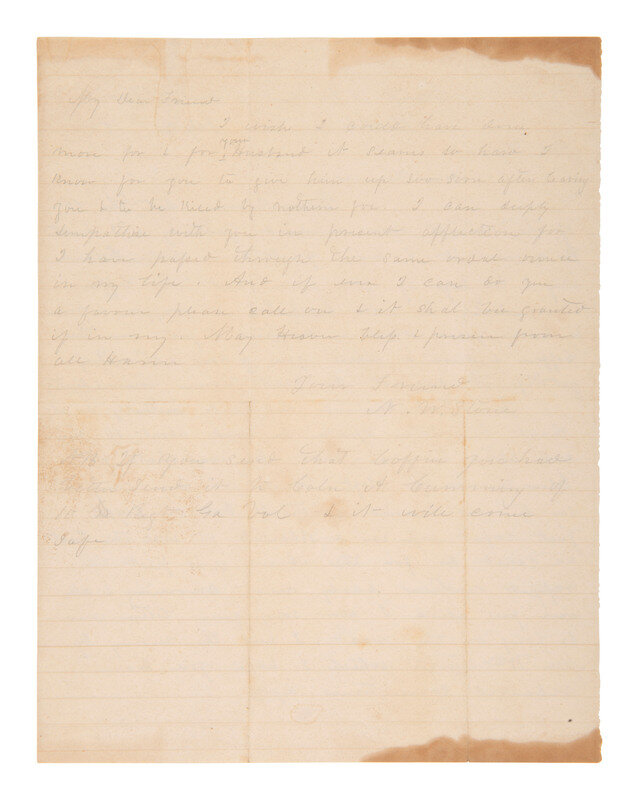 In this letter signed "N. W. Stone," he informs the widow that if she will send a coffin immediately, Colonel Cumming "will dispatch a waggon [sic] & men to have your Husban [sic] disentered [sic] & put in the coffin & buried when you can ultimately get it if it cannot be sent home immediately."