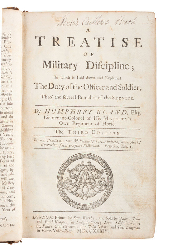 BLAND, Lieutenant-Colonel Humphrey. A Treatise of Military Discipline; In which is Laid Down and Explained the Duty of the Officer and Soldier, Thro' the Several Branches of the Service. London: Printed for Sam. Buckley and Sold by Knapton, et al., 1734. Third edition. Octavo. [xxxii], 360 pages. With seven folding engraved plates illustrating battle plans. Inscribed on title page "Lewis Cutler's Book." (Rear board completely detached.)