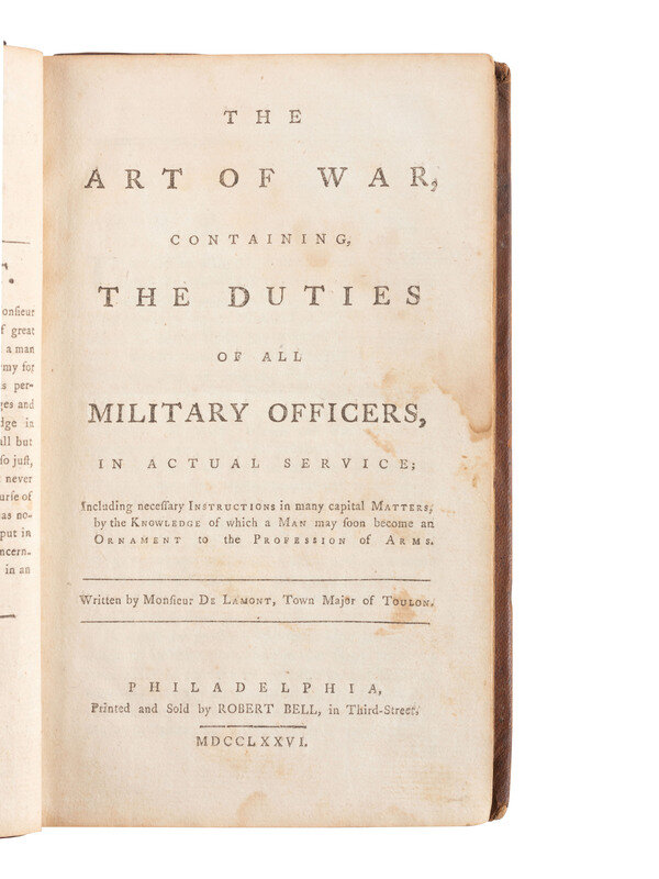 LA VALLIERE, Francois de La Baume Le Blanc. The Art of War, Containing, The Duties of All Military Officers in Actual Service; Including Necessary Instructions, in Many Capital Matters, by the Knowledge of Which, a Man May Soon Become an Ornament to the Profession of Arms. Written by Monsieur De Lamont, Town Major of Toulon. Philadelphia: Printed and Sold by Robert Bell, in Third Street, 1776. 264pp. (Missing title page.)