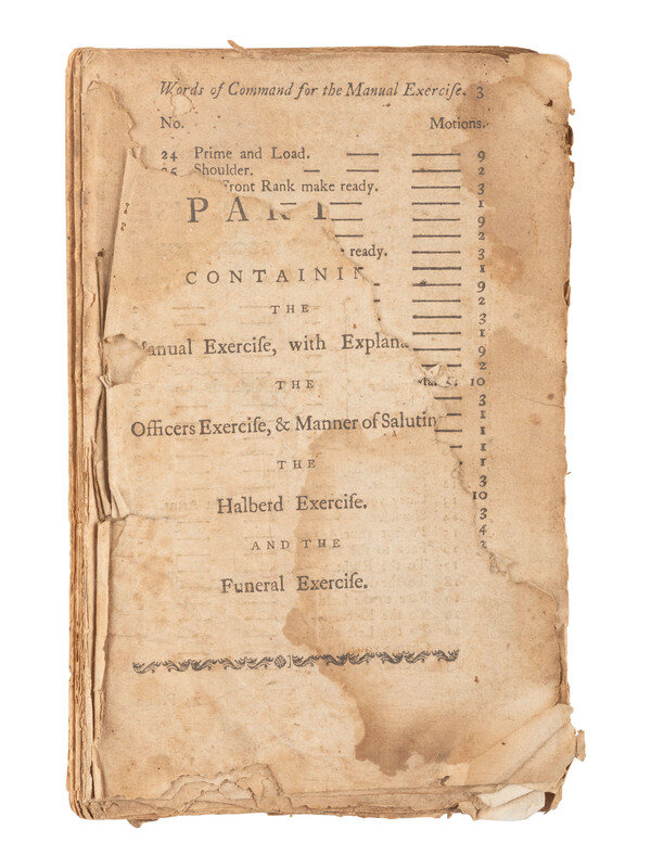 [With:] Two titles, one incomplete, possibly a portion of WINDHAM, William. A Plan of Exercise, for the Militia of Massachusetts-Bay: Extracted for the Plan of Discipline for the Norfolk Militia. Boston: Printing Office in Newbury Street, 1774. (Heavy wear, toning, dampstaining). -- TURNER, Rev. Joseph Brown, editor. "The Journal and Order Book of Captain Robert Kirkwood of the Delaware Regiment of the Continental Line." Part I and Part II. Wilmington: The Historical Society of Delaware, 1910. From Papers of the Historical Society of Delaware LVI. (Heavy wear to wraps, toning, dampstaining, chipping.)