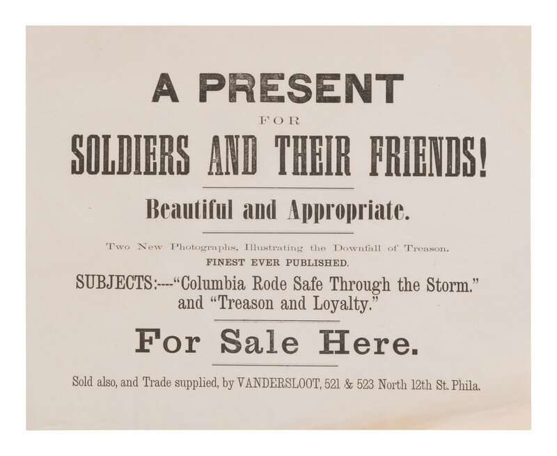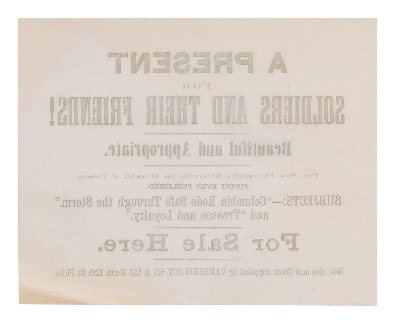 8 x 10 in. printed broadside promoting "A Present for Soldiers and Their Friends" in the form of two new photographs "Illustrating the Downfall of Treason." It is unclear who sponsored the broadside, though it clearly hung outside of an establishment selling the photographs as text announces that the images are "For Sale Here" as well as at the place of business of someone named Vandersloot, located at 521 & 523 North 12th Street in Philadelphia.