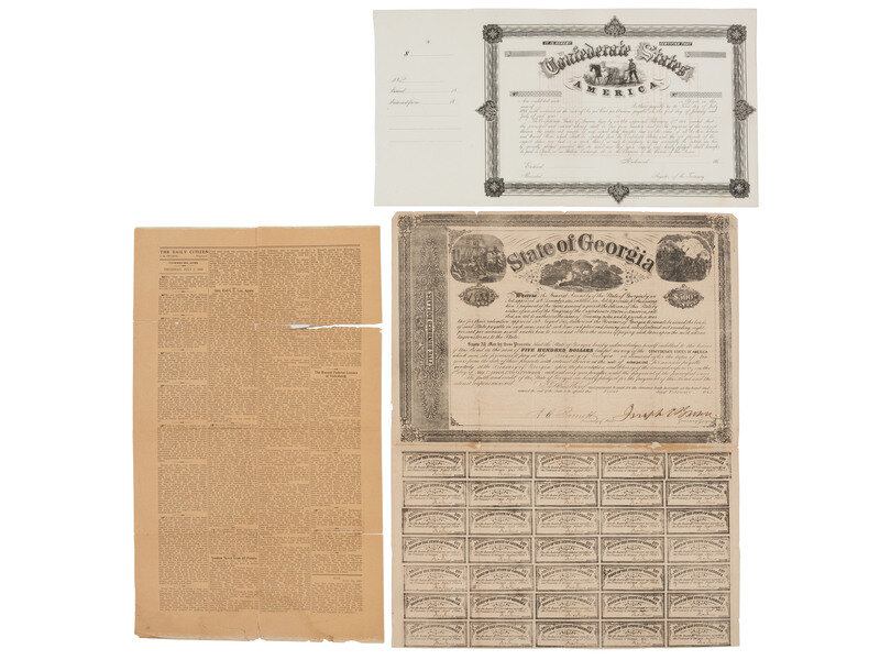 [With:] A group of 5 loose Confederate bonds, one featuring a center vignette of an enslaved man plowing; one Civil War-era state of Georgia bond; and a reprint of the 2 July 1863 issue of the Vicksburg Daily Citizen (heavily toned and separated into pieces along folds).