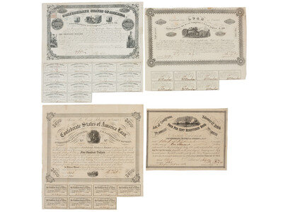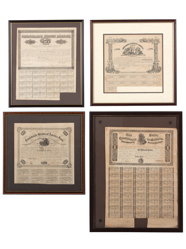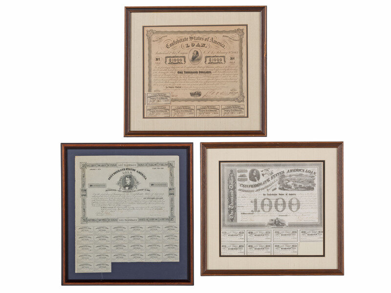 Lot includes 10 framed Confederate bonds: $1,000, Richmond, Virginia, 2 March 1863, Evans & Cogswell, Columbia, SC. Featuring the likeness of Jefferson Davis and a view of the city of Richmond. -- $1,000, Richmond, Virginia, 11 February 1863. Featuring the likeness of Christopher G. Memminger. -- $1,000, Richmond, Virginia, 1 April 1864, Evans & Cogswell, Columbia, S.C. Featuring the likeness of a Confederate soldier. -- $1,000, Richmond, Virginia, 2 March 1863, Archer & Daly, Richmond, VA. Featuring the likeness of Lt. Gen. T.J. "Stonewall" Jackson. -- $1,000, Richmond, Virginia, 24 October 1862, B. Duncan, Columbia, SC. Featuring an elaborate vignette at top with the portrait of Jefferson Davis at center and side "pillars" composed of agricultural products upheld by three men on each side. -- $1,000, Richmond, Virginia, 1 July 1864, Evans & Cogswell, Columbia, SC. Featuring the likeness of a 2nd National Confederate States flag and sailor. -- $100, Richmond, Virginia, 2 March 1863, Archer & Daly, Richmond, VA. Featuring the likeness of a gentleman posted at a tree at center and steamboat at bottom. -- $500, Richmond, Virginia, 2 March 1863, Archer & Daly, Richmond, VA. Featuring the likeness of a soldier warming his hands over a campfire -- $500, Richmond, Virginia, 1 May 1862, B. Duncan, Columbia, SC. Featuring likeness of Jefferson Davis with lines of advancing soldiers charging under fire at the Battle of Shiloh. -- $1,000, Richmond, Virginia, 1 April 1863, Geo. Dunn & Co, Richmond, VA. Featuring a vignette of the Old Custom House in Richmond.