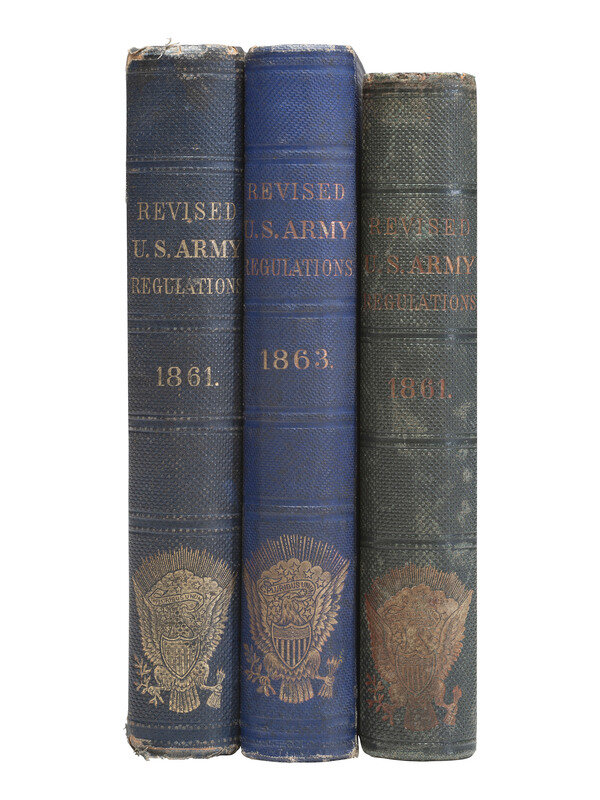 Revised Regulations for the Army of the United States, 1861. Philadelphia: J.G.L. Brown, printer. Front free end paper identified to "Lieut. J. Henrie Young, Co. "H" 127th Regt., NYS Vols." -- Revised Regulations for the Army of the United States, 1861. Philadelphia: J.B. Lippincott & Co., 1862. -- Revised United States Army Regulations, of 1861. Washington: Government Printing Office, 1863. Interior cover inscribed, "Presented to Capt. J.s. Farley," with additional names noted below. (Shelfwear to books, light occasional spotting/soiling to text, otherwise good).