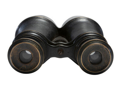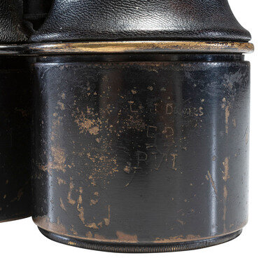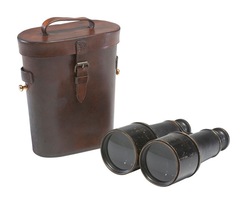 Pair of brass binoculars marked for D. Marr, London on ocular lens rims. 9 1/4 in. overall fully extended, with leather covering to barrels. Housed in a leather carrying case with brass fittings. When focus wheel is fully opened, engravings are revealed reading, "Presented to Mr. J. R. Davies of the Railway Clearing House, London by his fellow Clerks / as a token of regard and esteem and of their best wishes for his future welfare. March 1864."