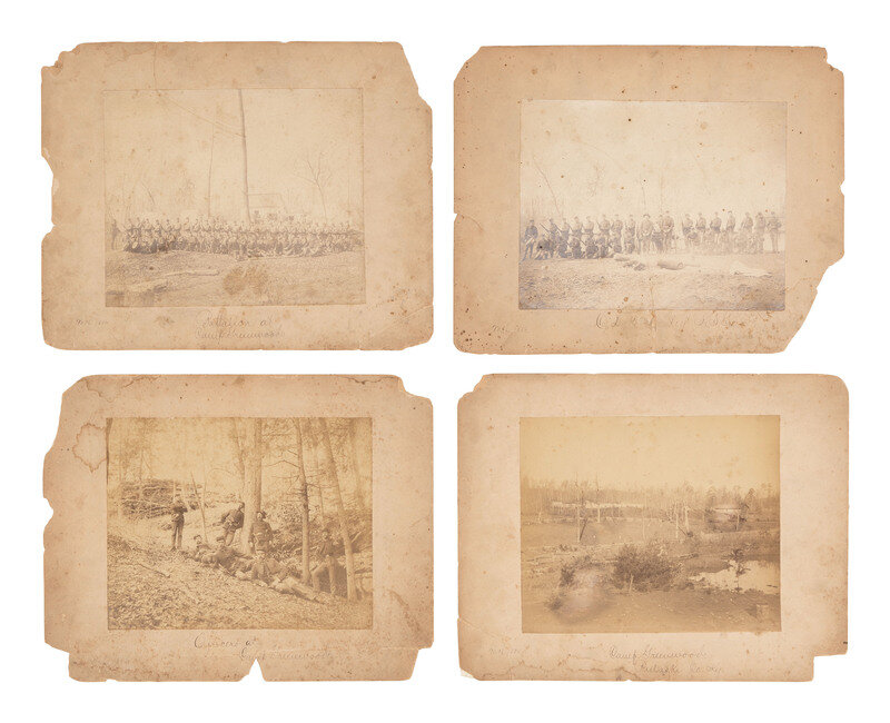 4 large format albumen photographs, each approx. 9 1/2 x 7 1/2 in. on larger cardstock mounts, with inked dates ("Mch 1886") and captions to lower margin. Each also bears verso affixed label for Hubert P. Potter, Bowling Green, KY. Images include: A group portrait of a company at camp, posed with their weapons at the ready and an artillery carriage behind them. Two tents and another structure are visible in the background. Inked caption identifies the group as "Co. D 2on Regt K.S.G." -- A more distant view of the camp, showing more structures and tents along with surrounding scenery. Inked caption identifies the location as "Camp Greenwood / Pulaski Co. Ky." -- A group portrait of officers and enlistees at camp, posed with their weapons at the ready underneath a large American flag. Artillery carriages, tents, and other structures are visible in the background. Inked caption identifies the group as a "Battalion at Camp Greenwood." -- An interesting portrait of 7 officers posed variously among trees, rocks, and fallen leaves, some of them reclining on the ground and others propped against the trunks of trees. Inked caption describes the scene as "Officers at Camp Greenwood." -- Together, 4 large format albumen photographs of the 2nd Regiment, Kentucky State Guards.