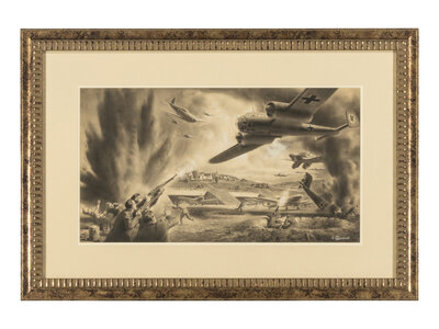 Watercolor, gouache, and charcoal on paper of a dramatic scene from the Battle of Britain (some minor staining). Visible area 24 1/4 x 37 in. Frame 26 x 38 in. Provenance: A Private Collection.