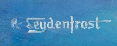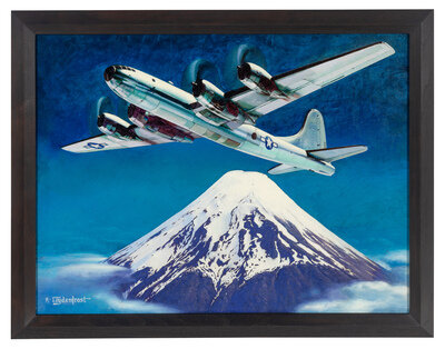 Oil on canvas depicting a B-29 Superfortress flying through Japanese airspace with Mount Fuji in the background, signed by Leydenfrost at bottom left (minor wear along edges, small loss at lower center, dent at upper left). Visible area 29 × 22 in. Frame: 32 1/4 × 25 3/4 in. Provenance: A Private Collection.