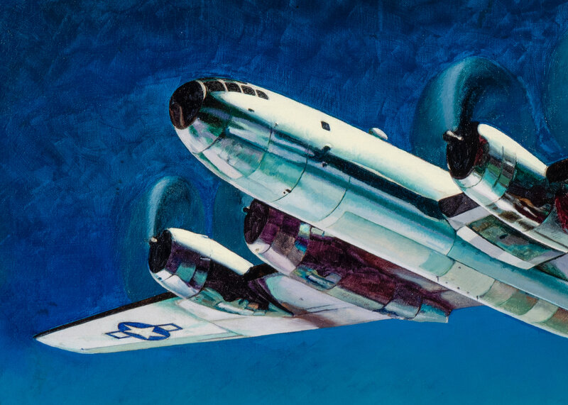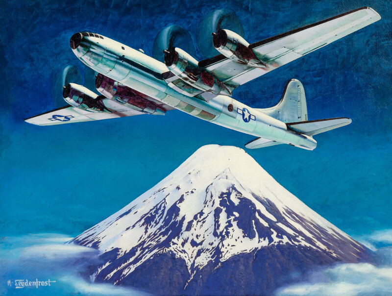 Alexander Leydenfrost was a Hungarian-American industrial designer and illustrator whose artwork during the Second World War brought the immediacy and drama of the conflict into the homes of millions of Americans. Throughout the war he produced dozens of images of American military prowess for Esquire magazine; this work was reproduced on page 91 of the November 1944 issue. The B-29 Superfortress was one of the largest aircrafts used during the Second World War. Its development and manufacture was famously the most expensive program of World War II, exceeding that of the Manhattan Project by over a billion dollars. Both the Enola Gay and Bockscar were B-29 planes, making it the only aircraft to ever deliver a payload of nuclear weapons during wartime.